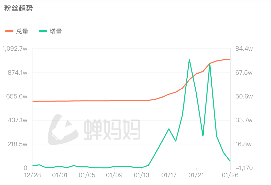 这背后是李亚鹏从 1 月 13 日开始的公益铺垫:他在抖音、视频号、小红书接连发布 4 条关于嫣然天使儿童医院的消息,其中《最后的面对》虽仅获 59.8 万点赞,却成功撬动公众对唇腭裂救助公益的关注。由于公益基金 “专款专用” 无法支付房租,直播带货成为公众支持公益的间接出口,10 天内其抖音账号涨粉 334万,截至1月28日粉丝量达到1000.8万。