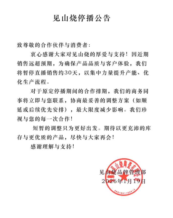 在连续两天“紫砂茶器精品专场”中,李亚鹏直播间内来自景德镇的瓷器茶具卖爆了,其中知名品牌“见山烧”在1月19日发布公告称,近期销售远超预期,为确保产品品质与客户体验,将暂停直播销售约30天。