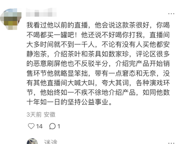网友的评论也从过去的质疑转向支持:“早几个月看他直播间只有 1000 多人,现在卖的瓷器茶具确实不错”“被逼到无路可退才发声,这份担当让人愿意支持”。
