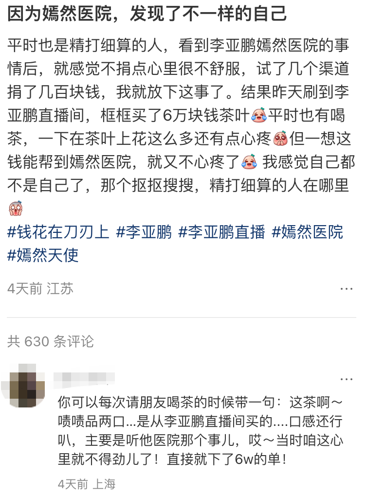 在李亚鹏“非理性”下单的用户中,既有对他常年积累的公益人设的认可,也有纯奔着茶叶而来的,还不乏有一些社会爱心人士前来发出公益支持。