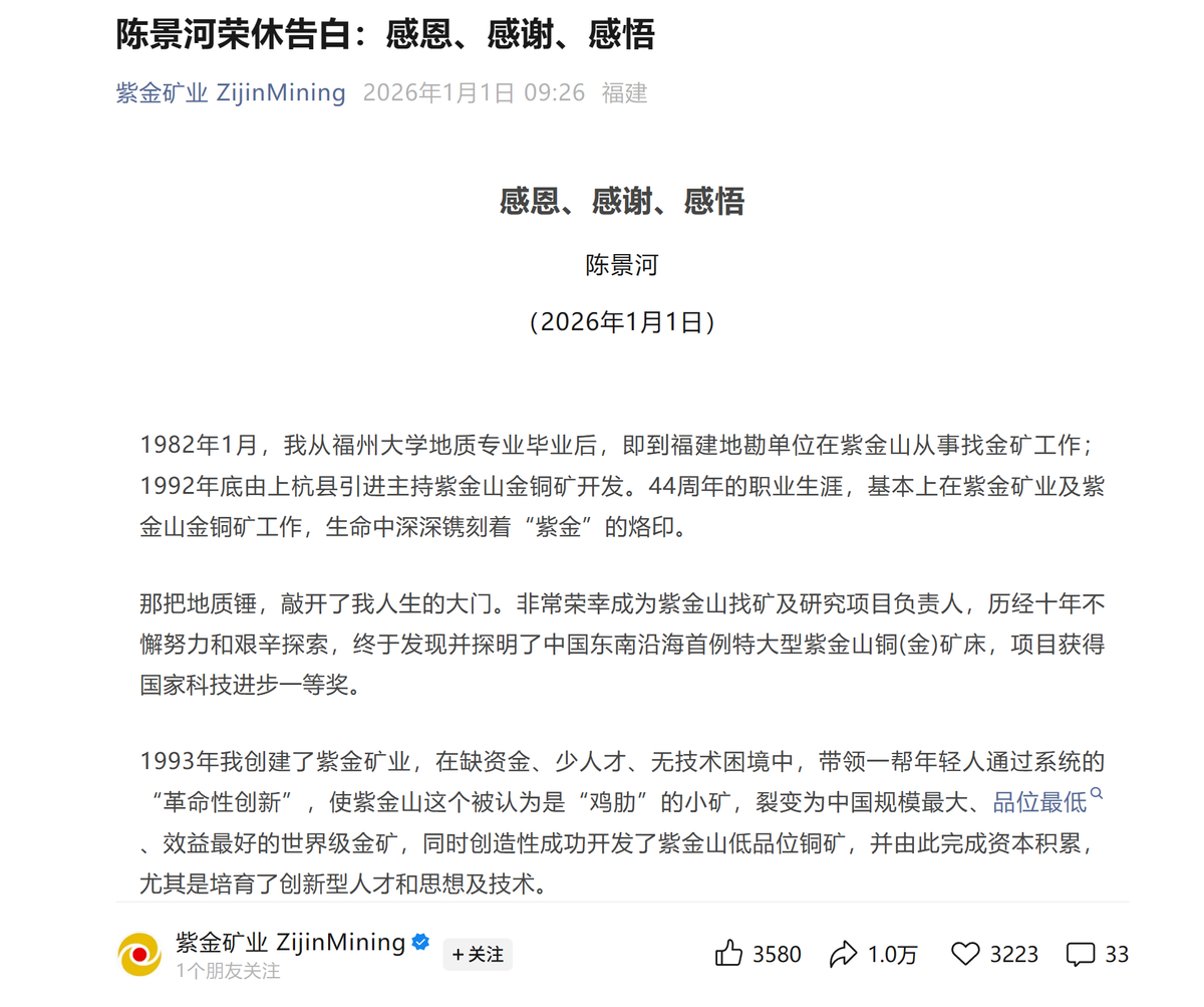这背后隐含的判断是,紫金以技术为起点、以低成本为护城河、以跨周期并购为扩展方式、以全球经营为底座的体系,已经足够成熟,交给下一代、交给长期,也不会影响紫金的未来发展。
