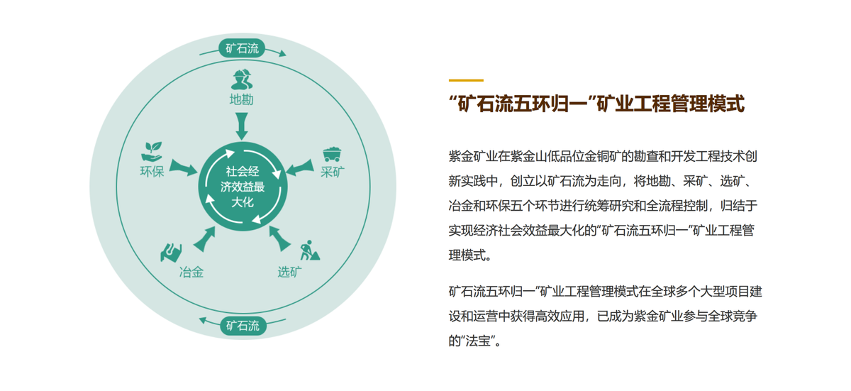 但这正是紫金真正与同行拉开差距的地方,尤其是几轮对紫金山的技改,奠定了日后紫金矿业以技术和管理滚雪球的基调,也就是今天挂在官网上的“矿石流五环归一”。