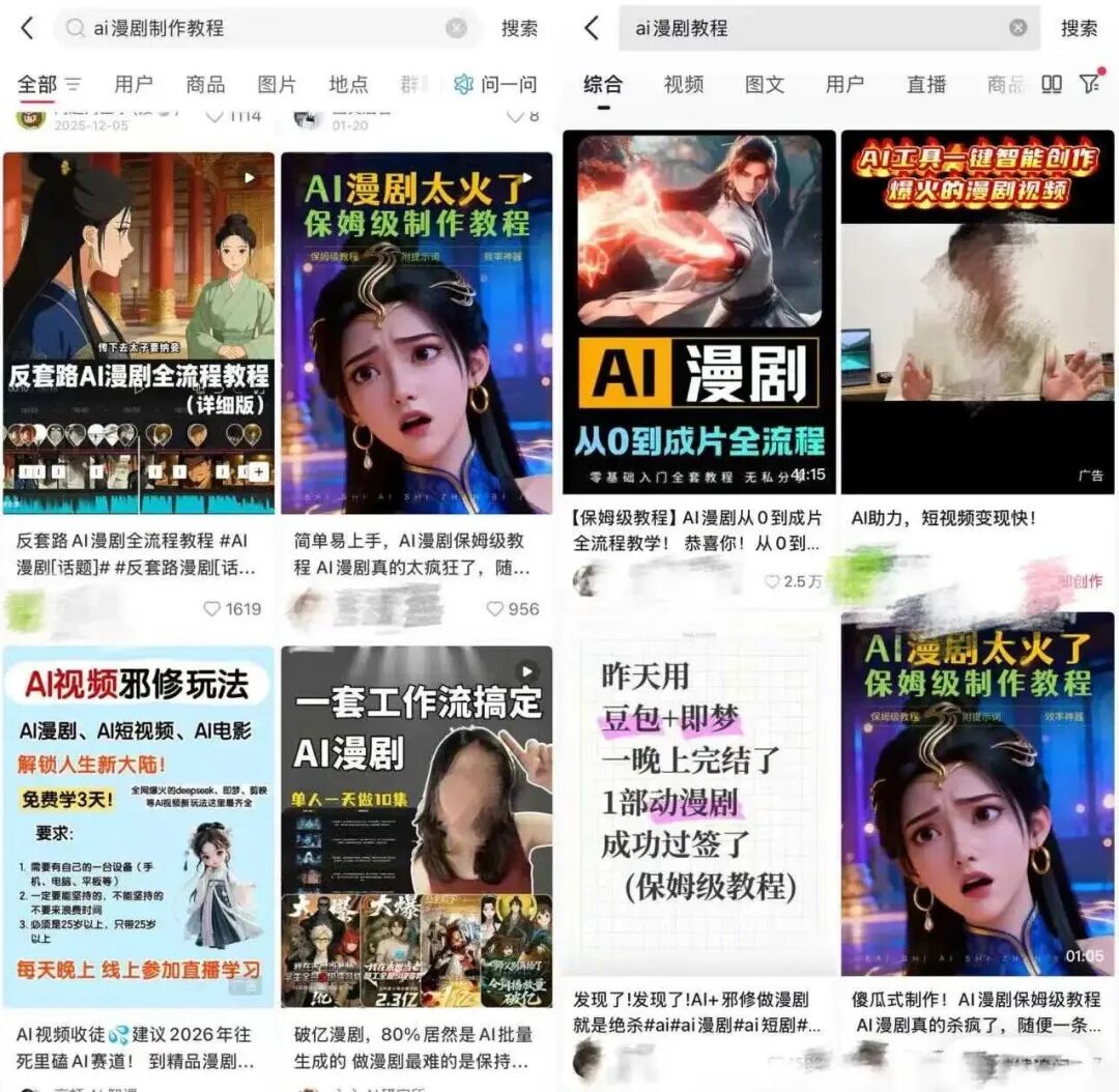 无数课程博主已经在网络上兜售AI漫剧课程生意。在社交平台,搜索“AI漫剧教程”,随便可见形色不一的相关内容。这些内容,普遍采用吸睛的关键字作为封面或标题,比如“简单易学”“小白友好”“免费试课”……