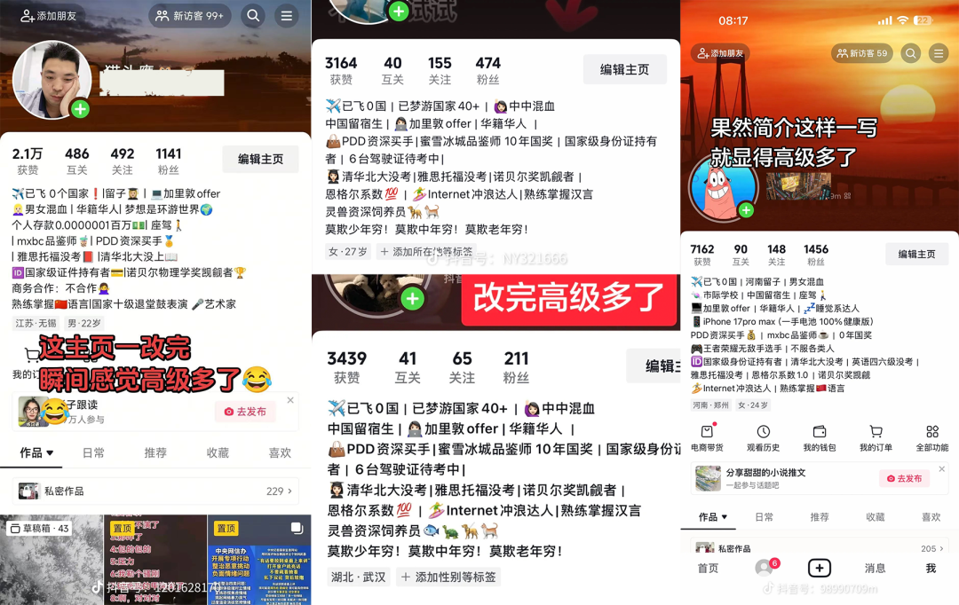 ▲ 最近抖音等平台上流行的改简介玩法,大家通过修改简洁表达个性