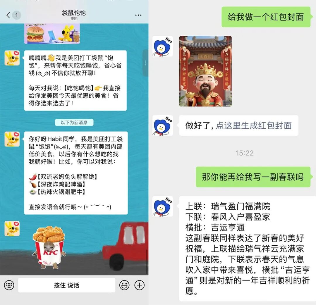 以及再比如美团曾在微信中运营的Agent,同样以好友形态存在,能够主动问候、发券、推荐菜品,并参与简单互动。