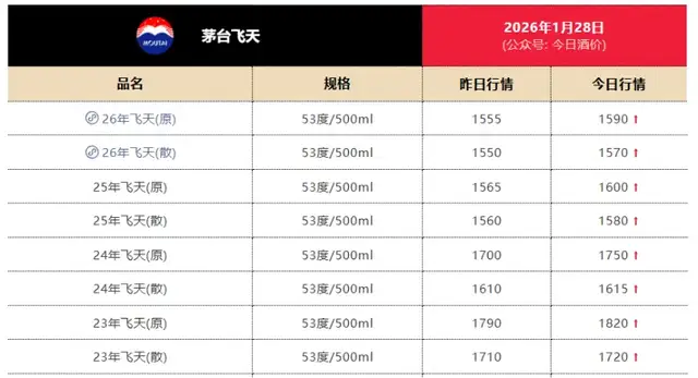 根据最新的市场数据,就在1月29日,2026年原箱茅台的单瓶价格已经硬气地上涨了20元,来到了1610元/瓶的位置。从附图的“今日酒价”也能看出,从23年到26年的各款飞天茅台,无论是散瓶还是原箱,昨日本就全线飘红,今天更是延续了涨势。