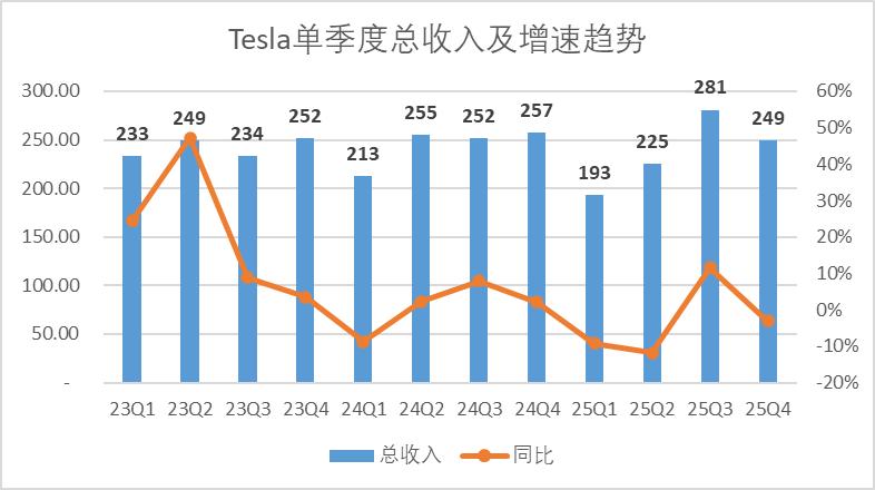 美东时间28日美股盘后,特斯拉公布了2025年第四季度的财务报告,录得总营收249.01亿美元,同比下滑3.1%,略高于分析师相对悲观的预期,营运利润14.09亿美元, Non-Gaap下EPS录得0.5美元,略低于分析师预期。![]()