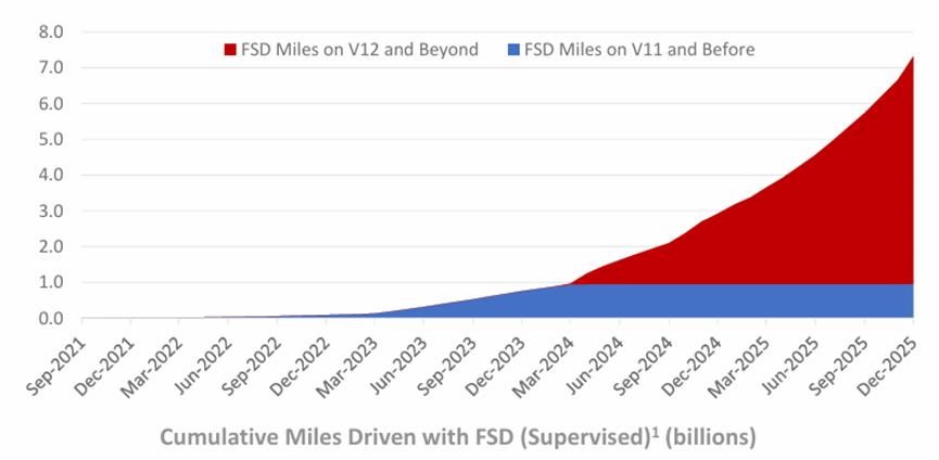 截止2025年底, 在旧金山湾区和奥斯汀提供服务的Robotaxi总量已经超过500辆,但此前的电话会中,25年年底的预期是提供100辆左右的服务。当然目前来看,部署区域和移除监督员的目标已经完成,Robotaxi业务整体发展不错,略慢于预期进度。