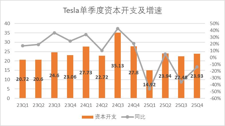 三季度特斯拉的资本开支录得23.93亿,同比下滑13.9%,如果仅从财报视角来看,2025年全年特斯拉的资本开支仅有85.27亿美元,不谈同行对比,甚至不及自己90亿的指引。