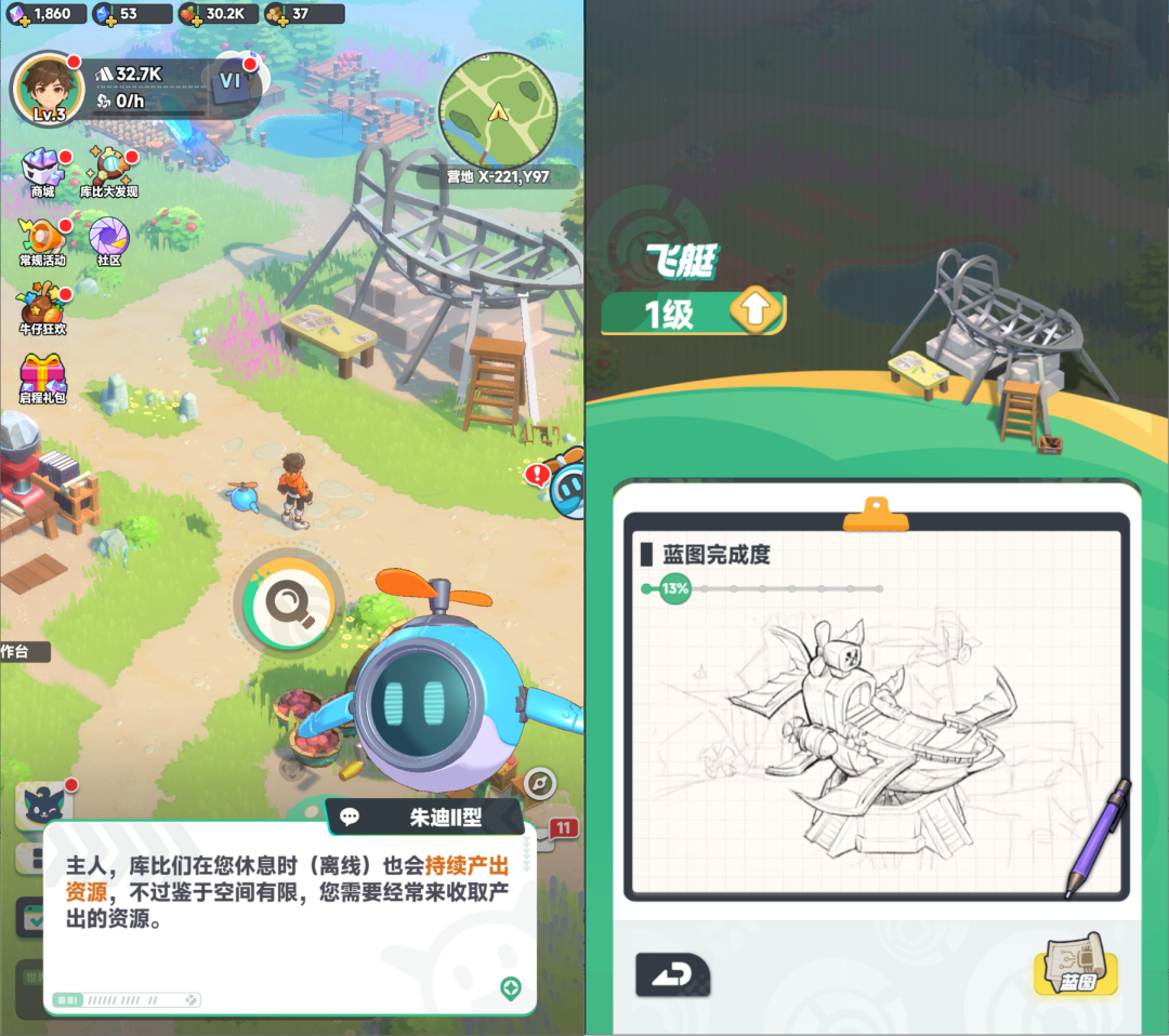 建造经营方面,玩家在搭建家园时,主要涉及到3类建筑。首先是类似矿井、采石厂、伐木场等与宠物及其他建筑成长密切相关的资源建筑,此类建筑可以派遣库比打工实现自动挂机;其次是类似工作台与孵蛋器的功能建筑;最后则是修复飞艇。