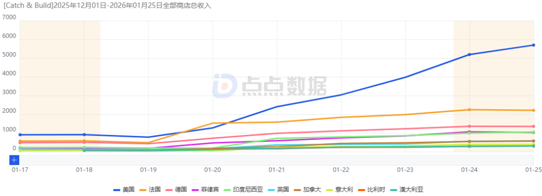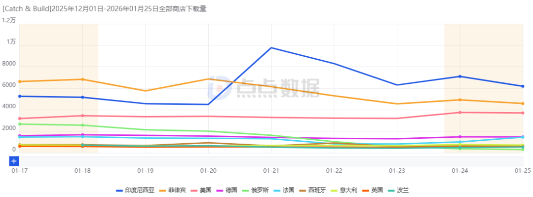 截止目前,《Catch & Build》开测9天,累计下载量约为22.4万,其中印尼、菲律宾、美国以25.52%、23.04%、13.65%的占比位列贡献榜TOP3。总流水在51万左右,美国、法国、德国以33.35%、17.97%、11.24%的占比位列前三。