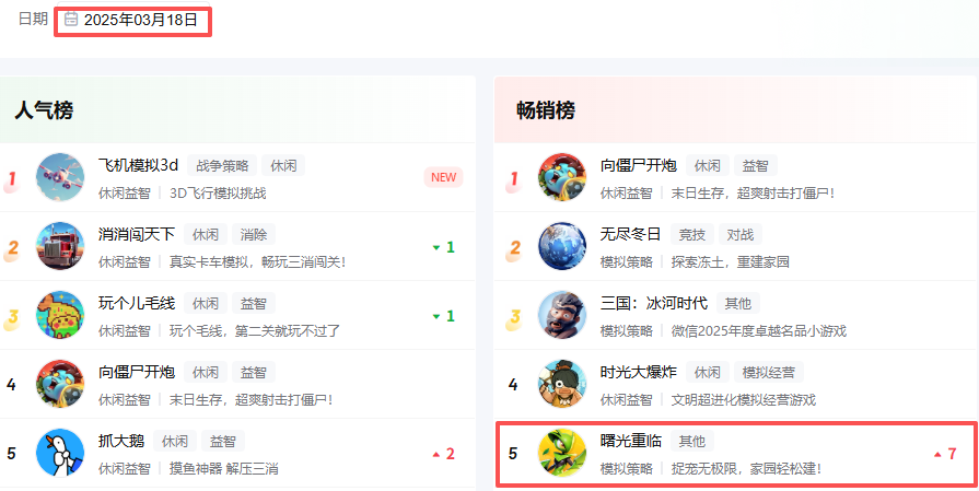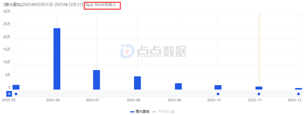 2025年3月15日时,《曙光重临》正式上线微信小游戏,伴随着整体投放力度的高速增长,同月18日便登上畅销榜第5名(月底来到TOP3),彼时日流水预估超200万,但5月开始游戏跌落至TOP10以下并缓速下滑,10月中旬彻底掉落到100名以后。