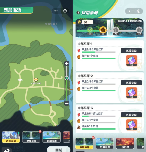 这一阶段,玩家需要通过迷雾探索机制逐步解锁“西部海滨”、“中部平原”、“怒潮海滩”、“烈日峰”等地图区域,每个区域都需要对应等级才可进入,同时也能获得对应品质的宠物与资源。