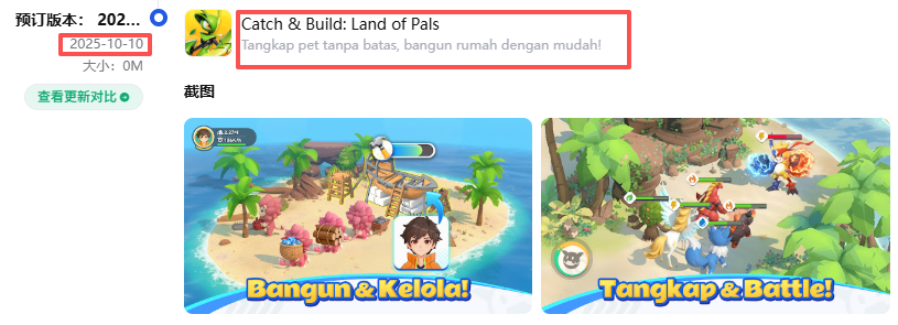 2025年10月中上旬,国际服《Catch & Build》在多个国际及地区的Google Play上架预订版本,2026年1月17日其在46个区域市场(主要是欧美与澳洲,包括东南亚部分国家)谷歌端开测。