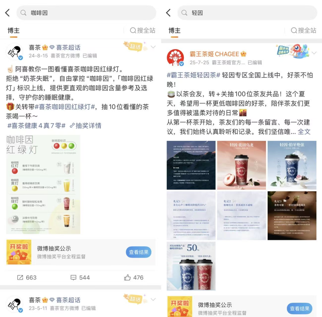 奶茶品牌们也很快从中捕捉到了趋势信号,比如喜茶持续强化“真茶”、“低糖”、“原料透明”的表达,在行业里率先开启咖啡因分级;霸王茶姬在奶茶杯上标注热量和咖啡因含量,同时也推出了新的“轻因系列”奶茶。