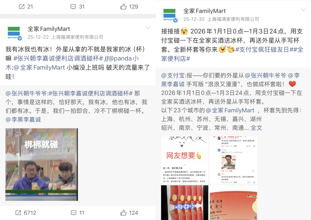情绪被不断放大后,网友顺势喊话全家与支付宝合作。全家与支付宝迅速回应,发起“疯狂碰友日”活动。活动期间,用户在全家便利店使用支付宝“碰一下”购买酒水,即可获赠冰杯,并有机会拿到签名杯套。这一设计高度贴合最初被网友打动的生活场景——便利店、冰杯、碰杯、朋友。品牌没有额外“加戏”,而是复刻并放大了那个被捕捉到的真实瞬间,让更多普通人也能参与其中。品牌只是站在一旁,帮大家把想要的氛围延续下去,商业动作也成为了情感叙事的自然延展。