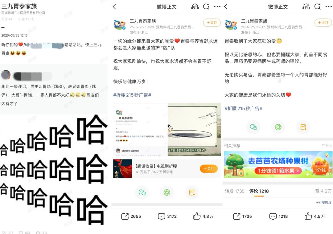 三九胃泰官微与剧迷互动
