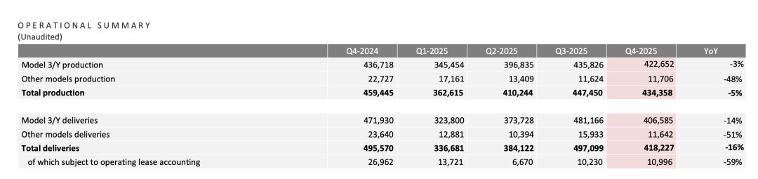 只是增长趋势没能延续到年底。第四季度一直是特斯拉的传统销售旺季,但当季特斯拉交付量仅为 41.8 万辆,同比下降 16%,不仅低于上一季度,也远逊于市场对旺季反弹的预期。