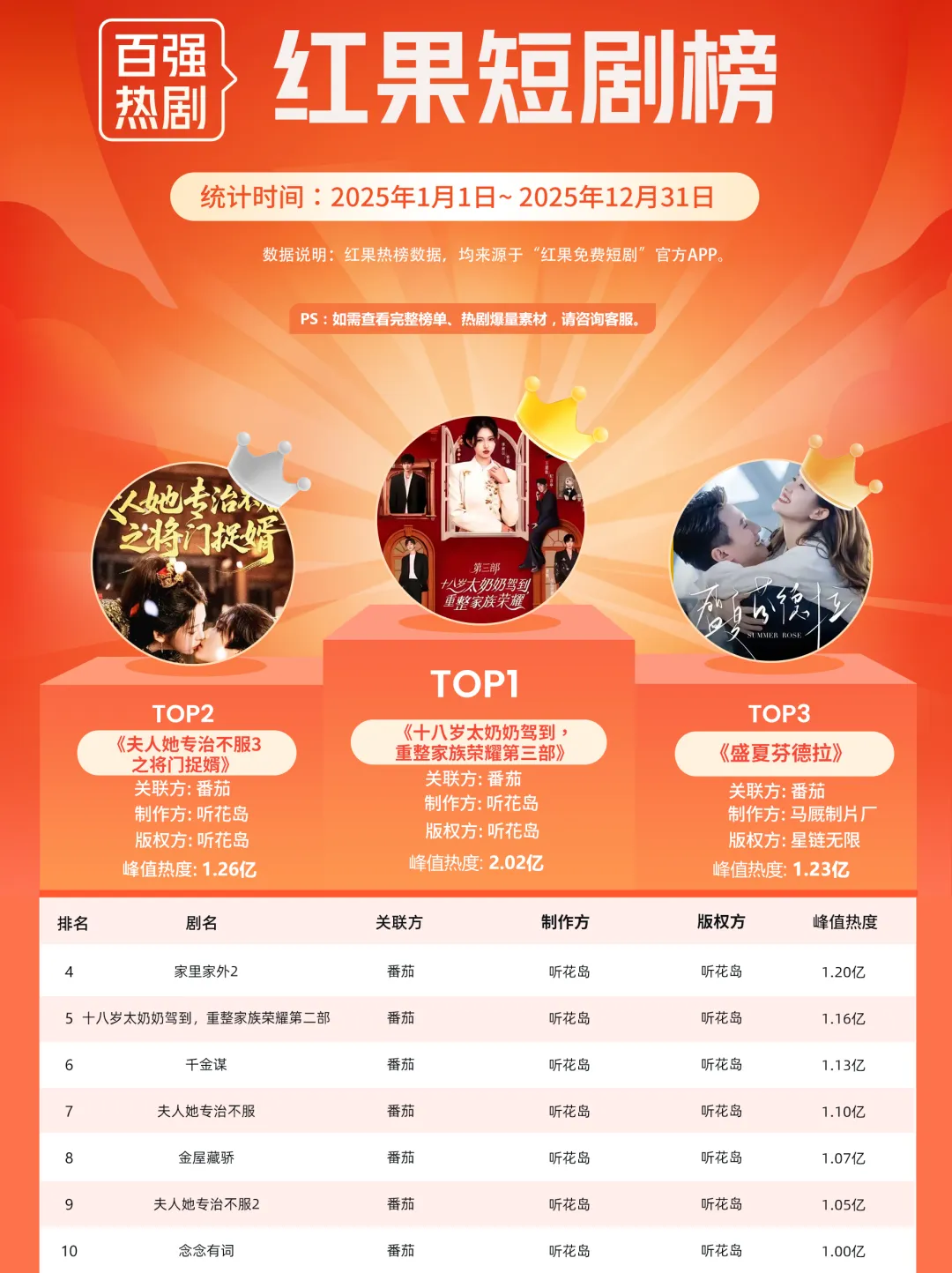 这种策略极大地降低了试错成本,保证了极高的爆款率。2025年红果年度榜单上,听花岛占据九席,就是这一策略成功的最好证明。