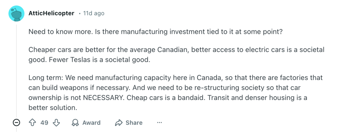 另一方面,这些中国电车很难在短期内对当地制造业产生影响,因为加拿大当地还没有成熟的电动汽车产业链,故而几乎并不会有人因此失业。与之相反的是,加拿大人更希望中国车企能在当地建厂,带来就业岗位。