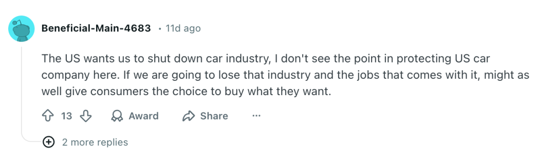 网友“bcsam”指责道:“三大汽车制造商并不希望我们加拿大人拥有最好的产品。他们只想继续向我们销售劣质且昂贵的汽车,并将利润转移到南方。他们在研发方面的投入不足,无法提高产品质量或推进技术发展。说实话,他们在电动汽车领域已经败下阵来,如果政府停止保护他们,阻止中国汽车公司(尤其是在北美)销售产品,他们最终也会在燃油车领域败北。”