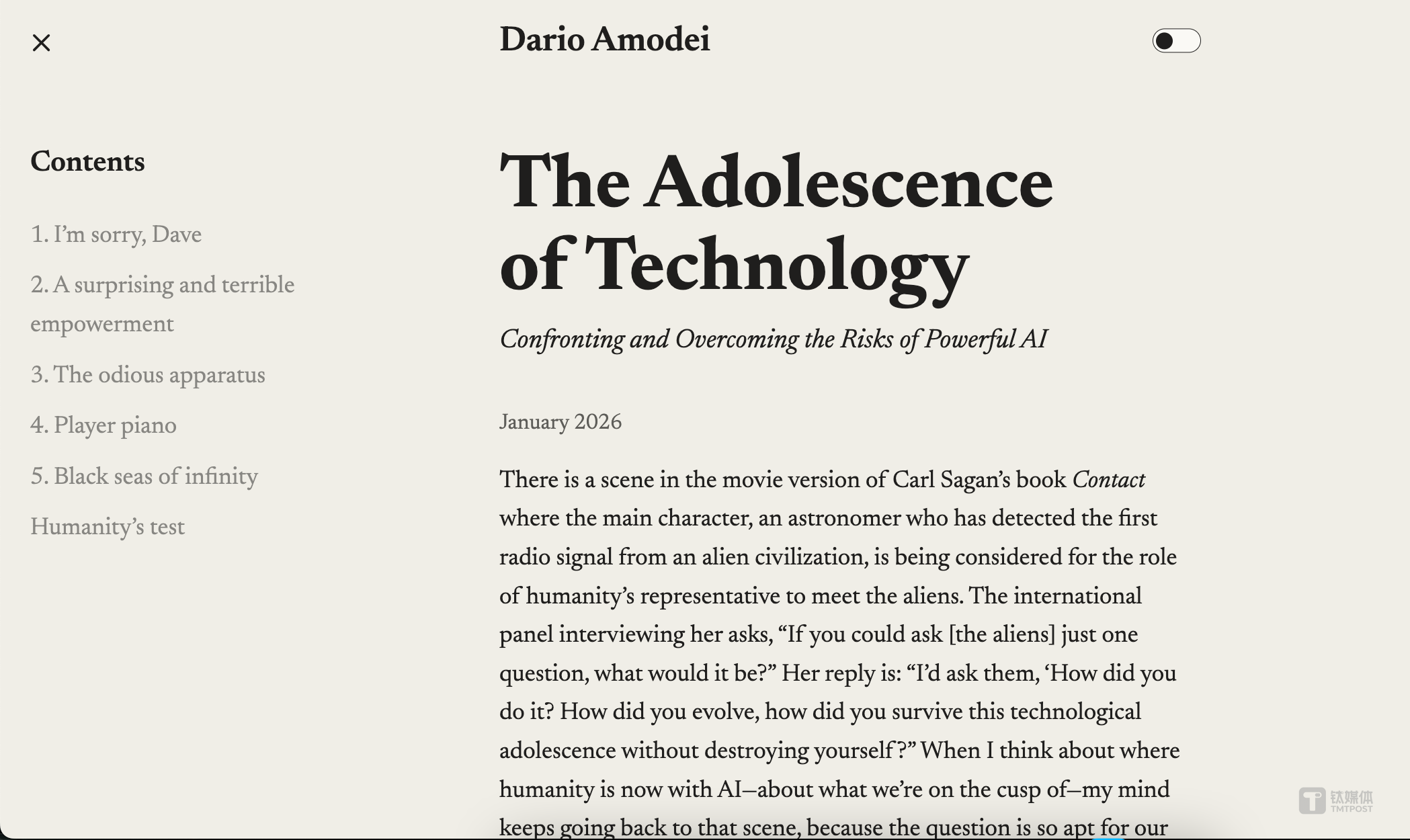 全文地址:https://www.darioamodei.com/essay/the-adolescence-of-technology#humanity-s-test