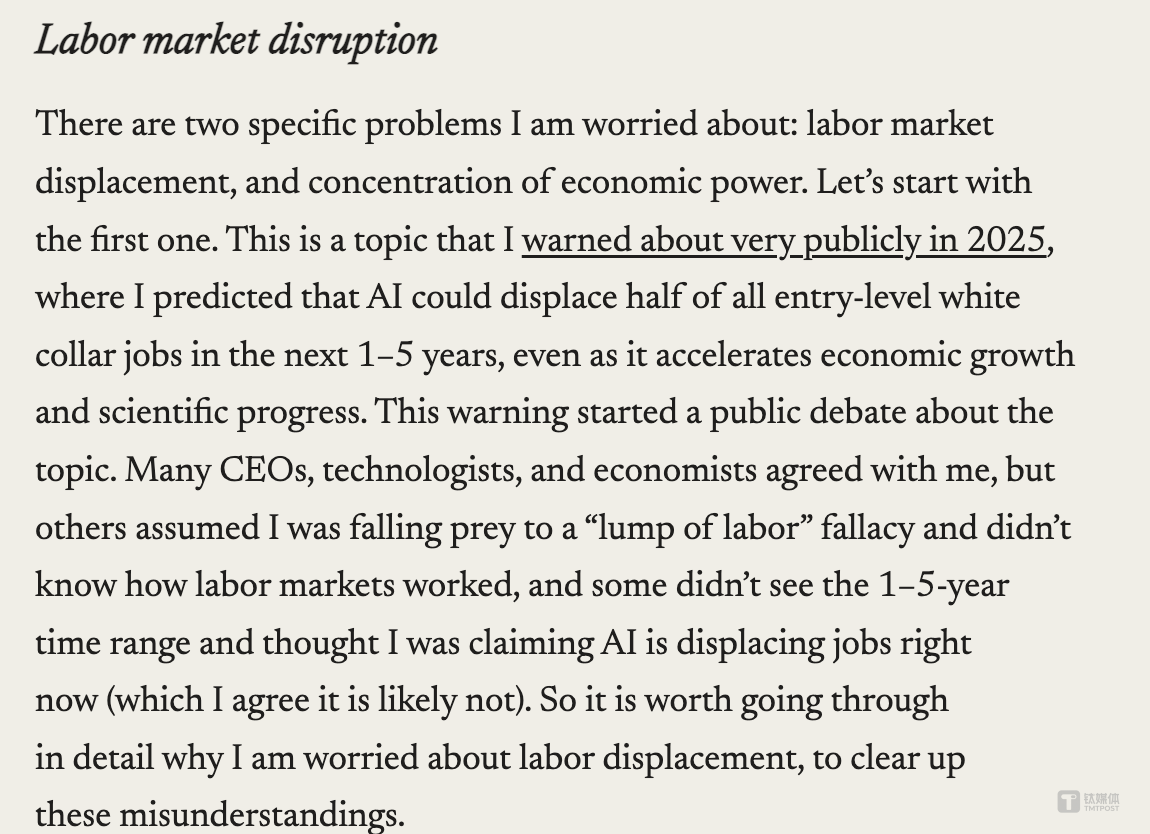 文章近2万多字,Amodei试图从AI模型自身风险、个人和组织风险,国家层面风险,以及经济和社会层面的风险等多个维度展开论述。