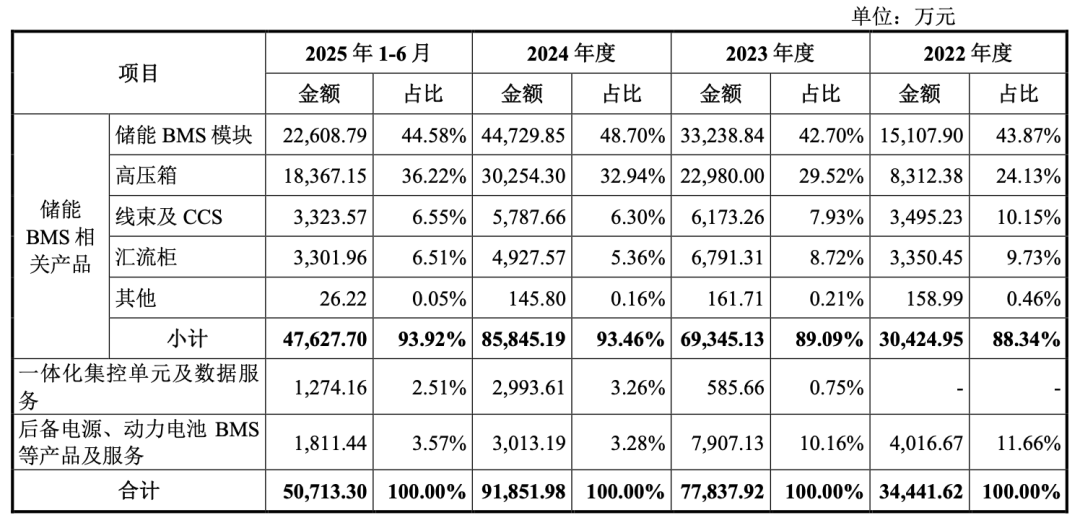 其中,储能BMS相关产品贡献了公司绝大部分营收,2022年至2025年上半年(以下简称“报告期内”)的营收占比分别为88.34%、89.09%、93.46%及93.92%。