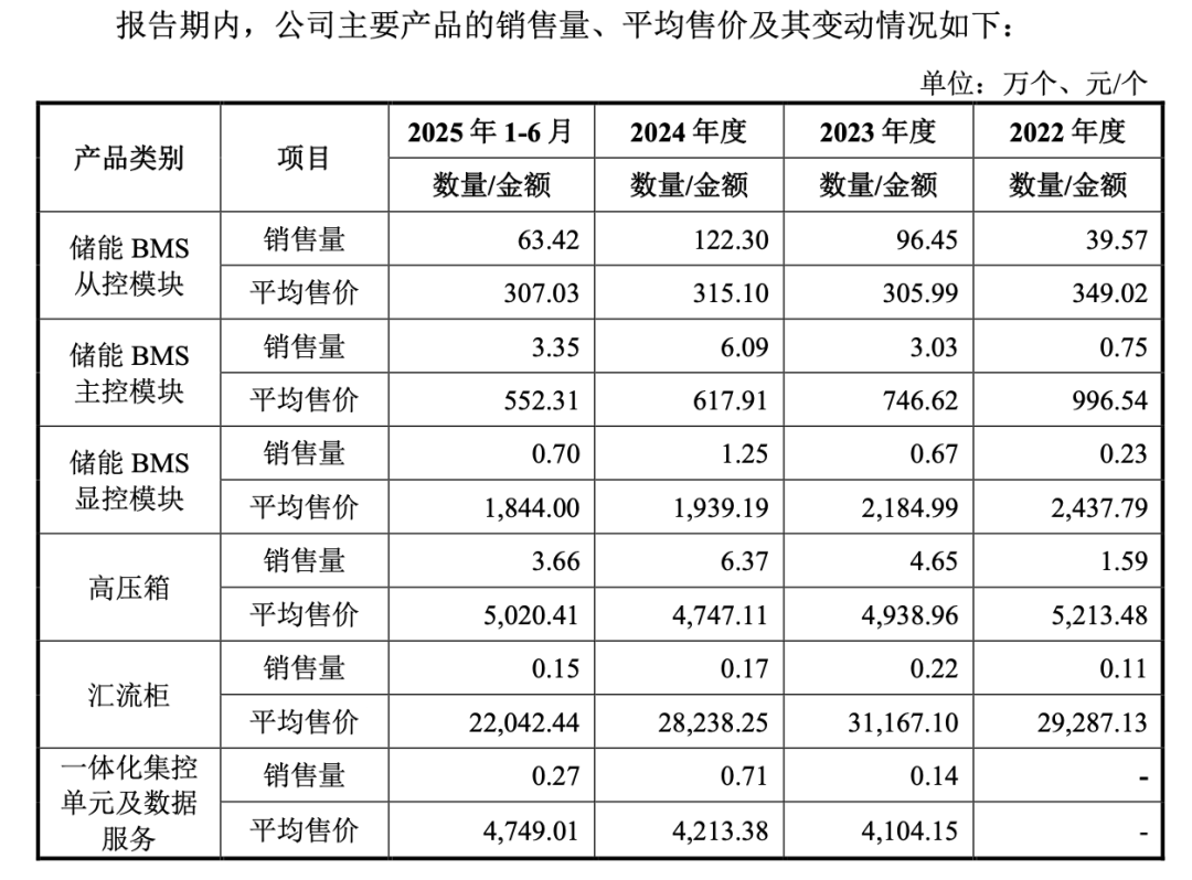 招股书显示,高特电子储能BMS业务多款产品的平均售价均有下跌,其中储能BMS从控模块的平均售价从2022年的394.02元降至2025年上半年的307.03元,降幅22%;