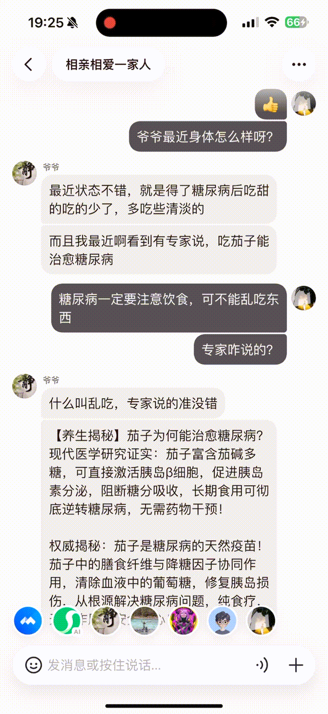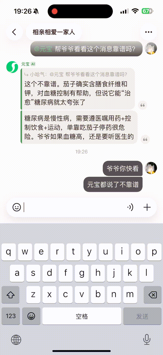 爷爷转发一条《吃茄子治糖尿病》,我们立刻@元宝:“帮忙看看这个靠谱不?”元宝果断辟谣,接着问:“那爷爷有糖尿病,平时该怎么吃?”