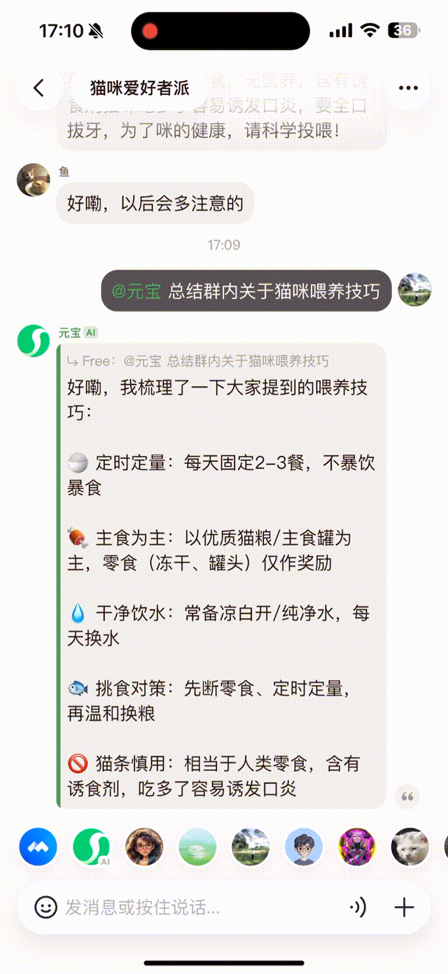 首先,我们创建了一个“猫咪爱好者元宝派”。在大家七嘴八舌,讨论喂养技巧后,只需问一句“@元宝 总结一下刚才关于喂养技巧的要点”,它便能光速梳理出一二三四条清晰结论,瞬间化身养猫小百科。