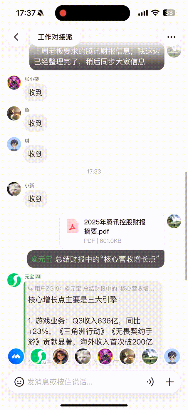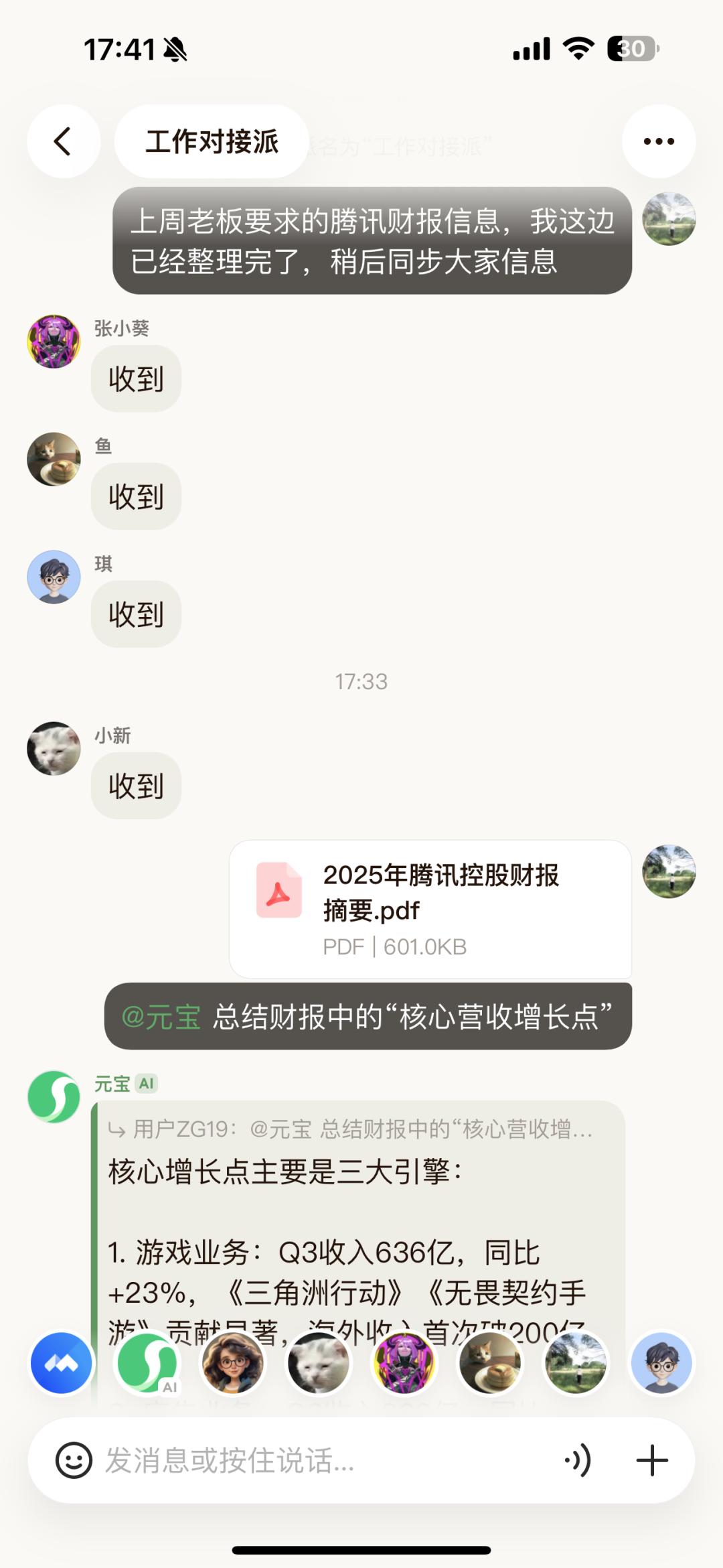接下来,切换到打工人模式。建个工作群,然后把《2025年腾讯财报摘要》PDF甩进去,很快,各个同事就开始刁难起了@元宝这个赛博实习生,让TA总结核心增长点、 提取“研发投入占比”的具体数据、回答群友提出的“腾讯云业务增长原因”问题。