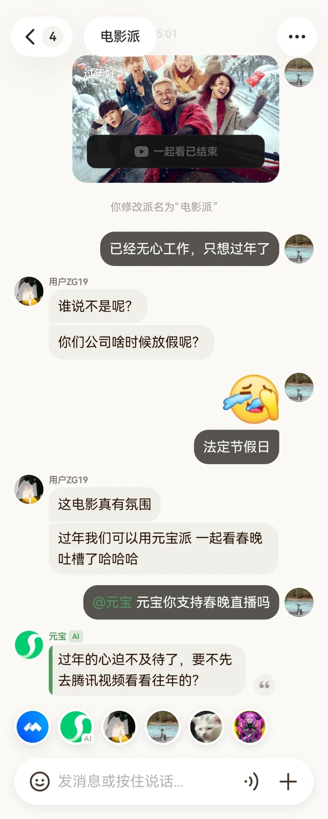 在这里,元宝作为常驻NPC,永远在线、随时待命。你可以创建或加入任何一个“派”,然后就能像@好友一样,随时随地@元宝,让它参与到一群人的聊天、协作与娱乐中来。从此,群里不止有毒舌损友、长期潜水的i人,还多了一个24小时在线、能接梗、能干活、能陪大家听歌看电影的AI“派友”。
