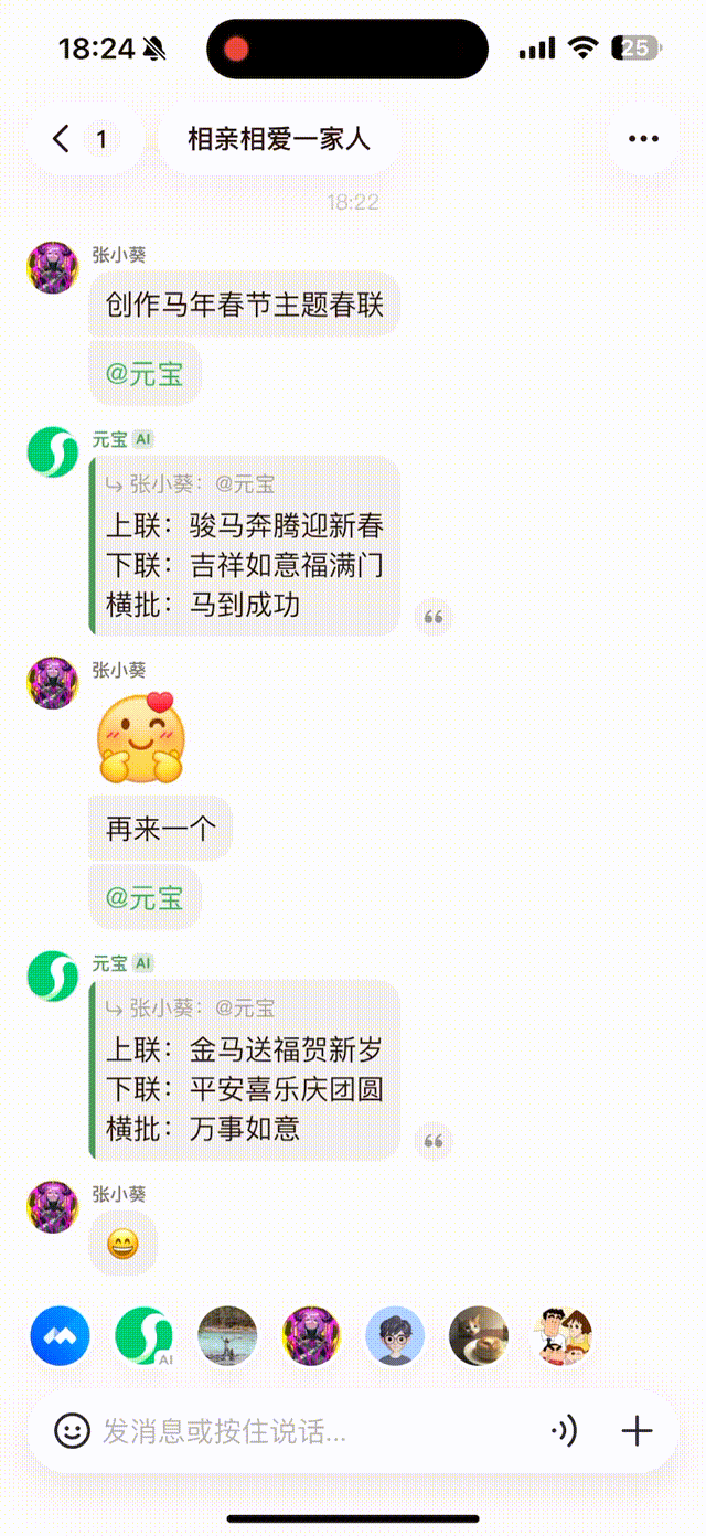 首先,让元宝生成“拜年表情包”,再基于上传的家庭合影,给每个人加“春节元素”。