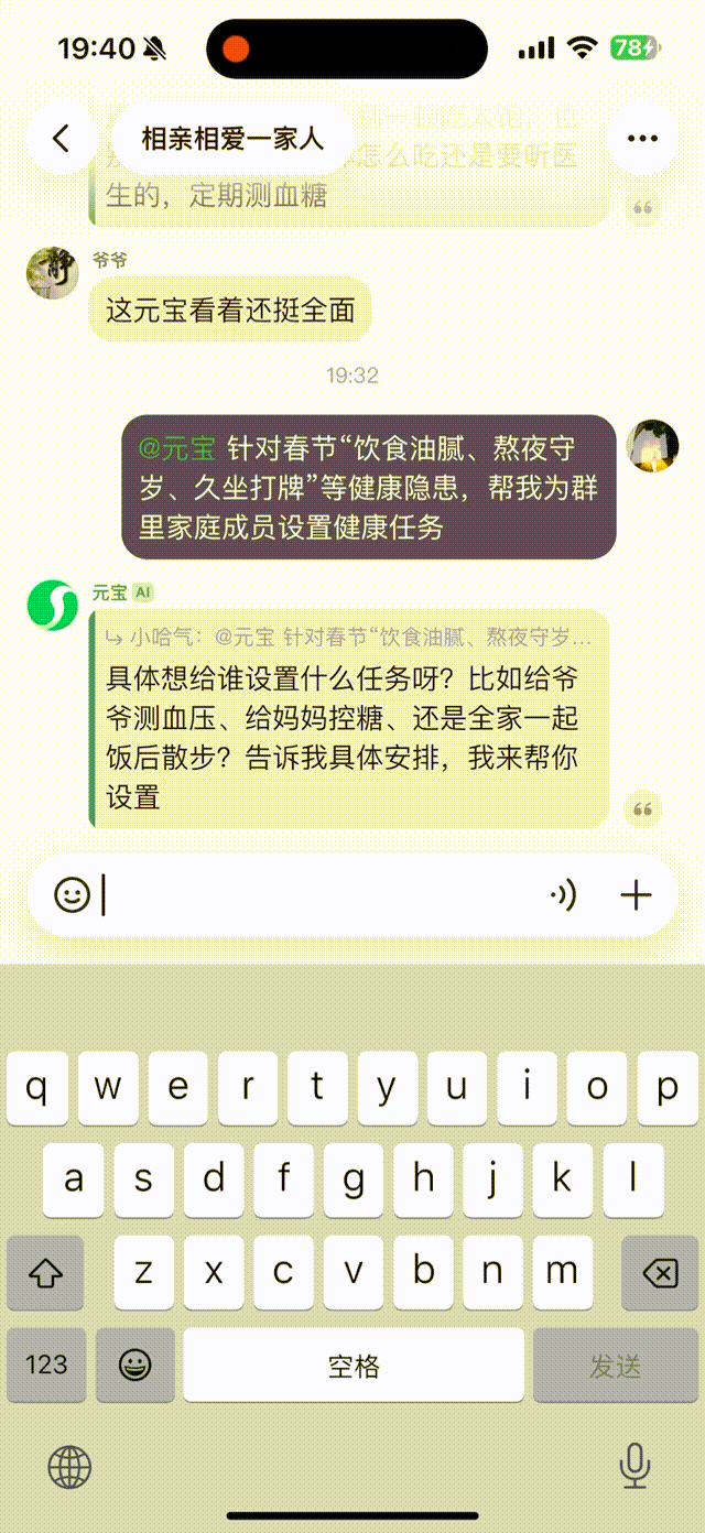 设置完成后,元宝就化身成一个脾气贼好、但极其执着的电子健康管家,到点就在群里“点名”。对没法时刻盯着父母的我们来说,这功能直击痛点。