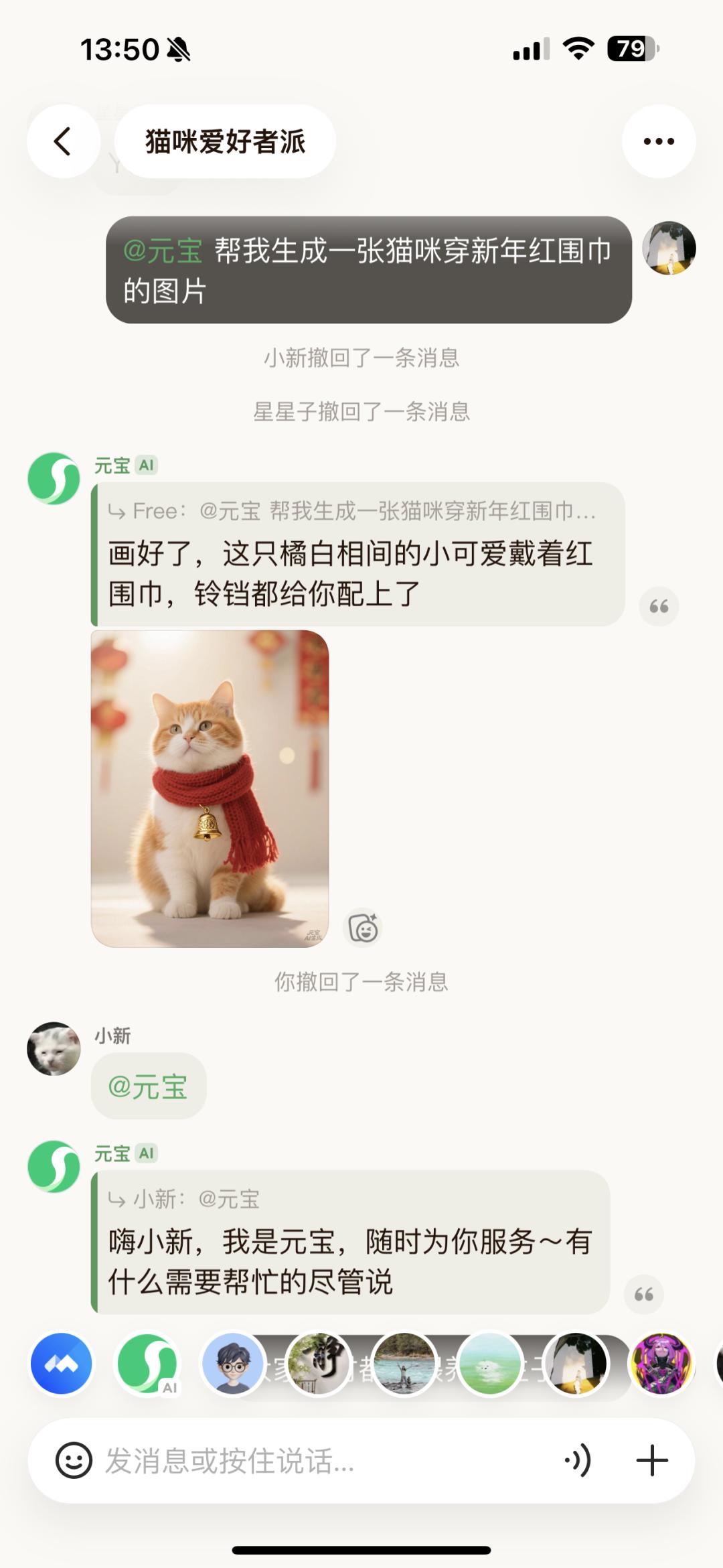 最后,还能@元宝,给大家的猫分别生成一张穿新年红围巾的图片,就说,哪个猫主子能忍住不趁机秀一波,让自家的猫艳压群喵?