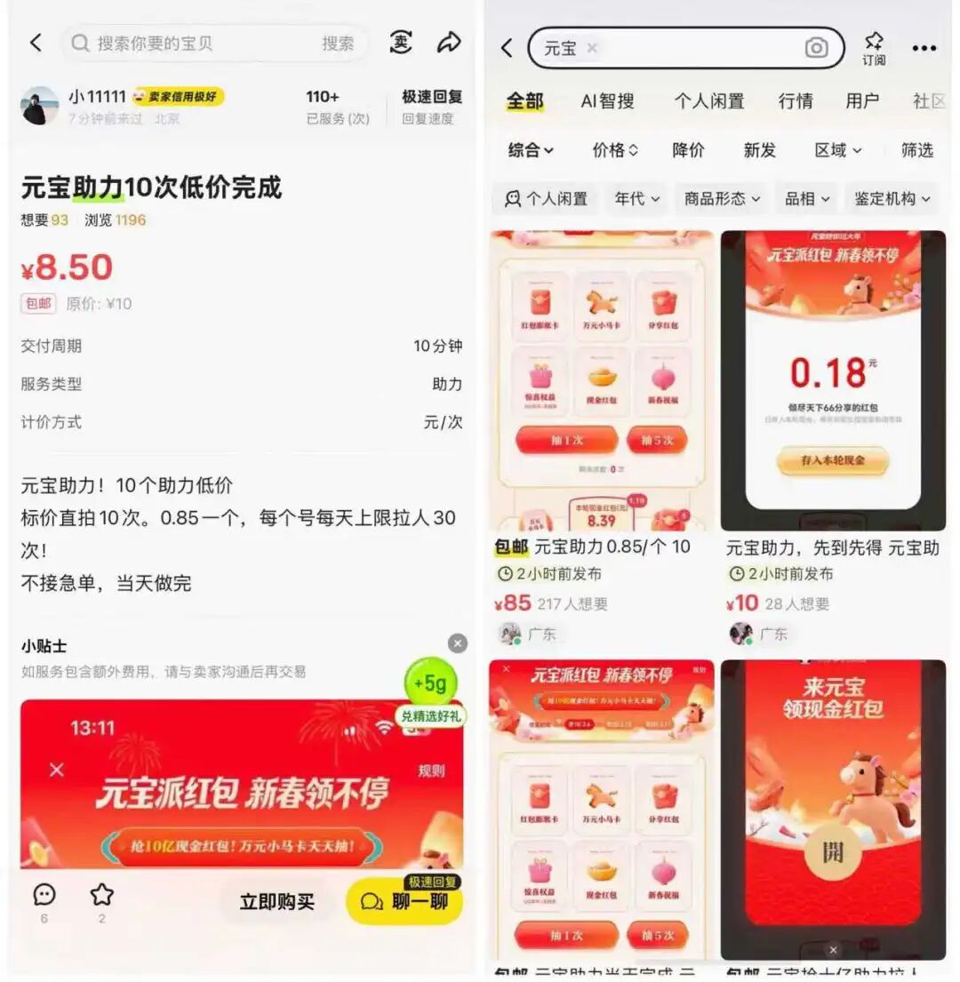 元宝红包帮点服务,图源/闲鱼