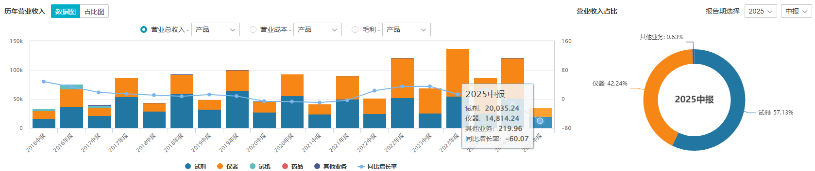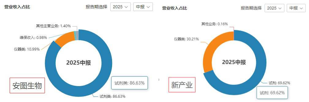 2025年半年报显示,公司仪器收入占比仍达57.13%,试剂收入占比仅42.24%,这一比例与行业龙头差距显著。同期,安图生物、新产业的试剂收入占比分别为86.63%、69.62%,试剂业务的高毛利特性得以充分发挥。