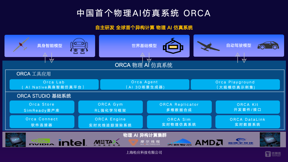 在这一背景下,松应科技自主研发国内首个物理AI系统ORCA,全栈对标巨头英伟达 Omniverse 物理 AI操作系统,构建高精度、实时、多物理场融合的物理AI数字训练场,通过“1:8:1”混合数据训练策略(10% 示教 + 80% 仿真合成 + 10% 现实微调)大幅压缩具身智能体在产业场景中的训练试错成本,并深度适配国产沐曦、摩尔线程、天数智芯、瀚博等头部厂商GPU 、异构算力和工业软件生态。目前,ORCA 已服务数十家央企、国企、国家级/省级机器人创新中心、人形机器人与具身智能中试基地、头部制造业及具身智能模型厂商,覆盖高端装备制造、电子信息、医疗康养、交通物流、大宗消费等重点行业。