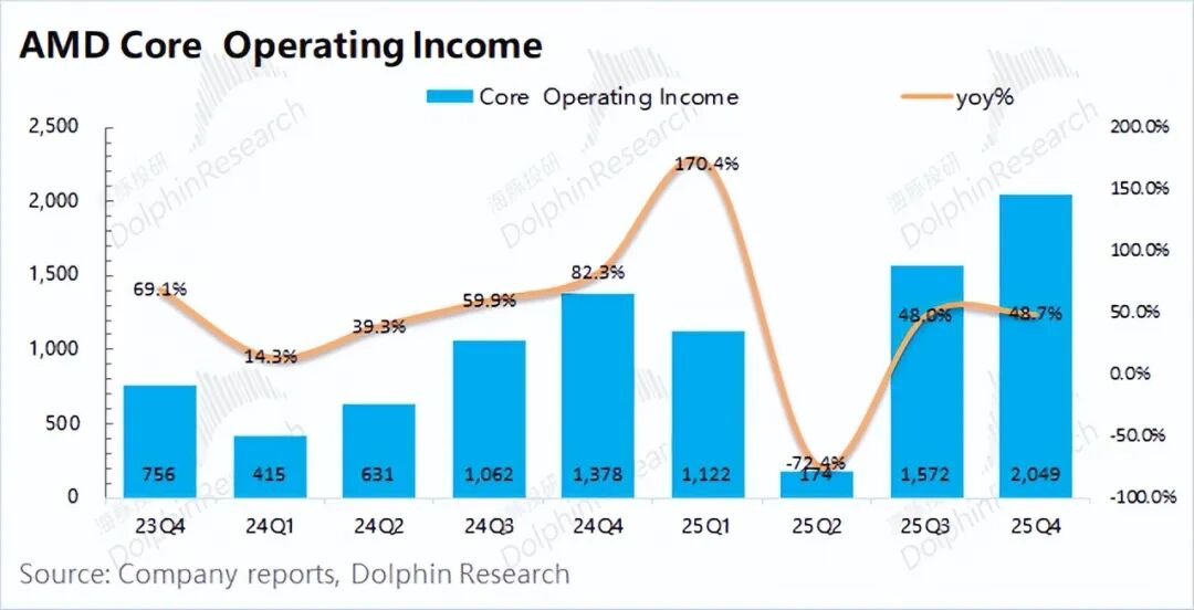 在剔除收购费用等影响后,海豚君测算AMD本季度的核心经营利润为20.5亿美元,继续回升。本季度公司受MI308库存销售的影响(对毛利约3.6亿增厚),如剔除该影响,公司本季度核心经营利润仍有提升,受益于服务器CPU回暖的带动。
