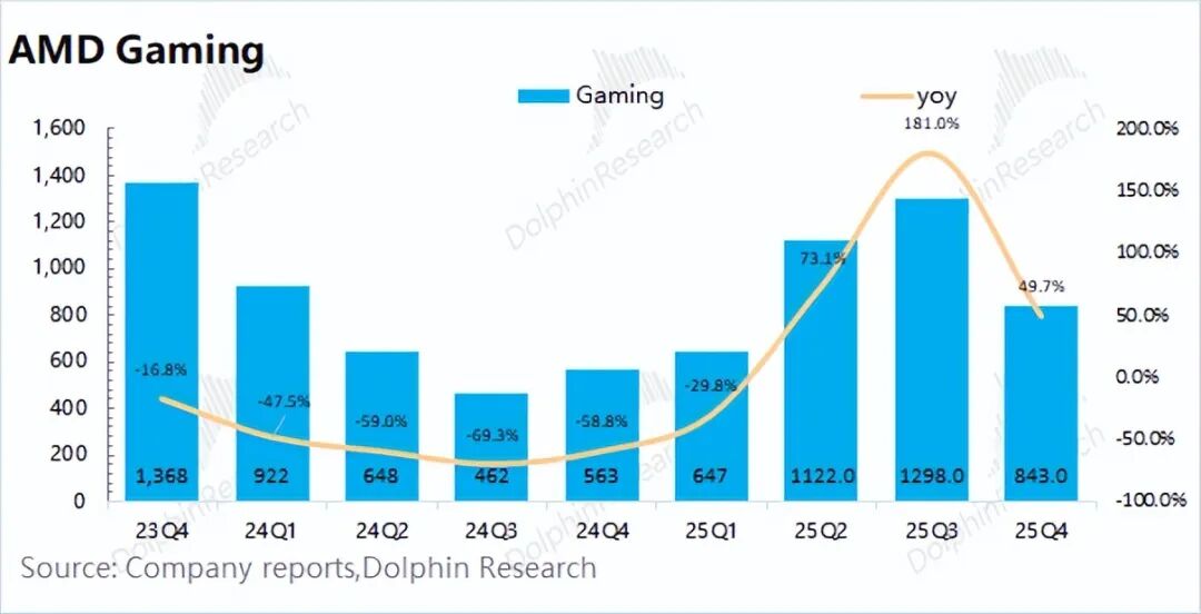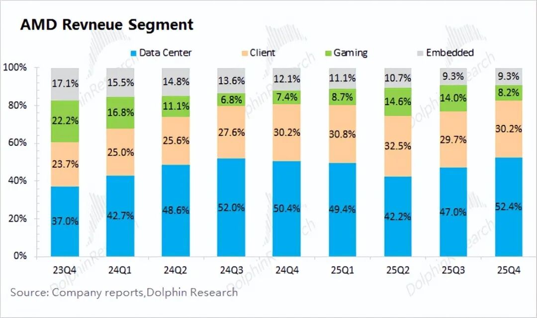具体来看,①半定制业务:同比增长但环比下滑,预计2026年因主机周期进入第7年,而微软下一代Xbox(搭载AMD半定制SoC)预计2027年推出;②游戏GPU:Radeon RX9000系列在假期期间需求旺盛,渠道销量增长。