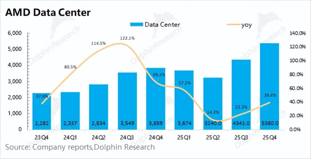 AMD的数据中心业务在2025年第四季度实现收入53.8亿美元,同比增长39%,达到市场上调后的预期(53亿美元左右)。本季度的同比增长,主要服务器CPU出货增长和MI308的再次销售。