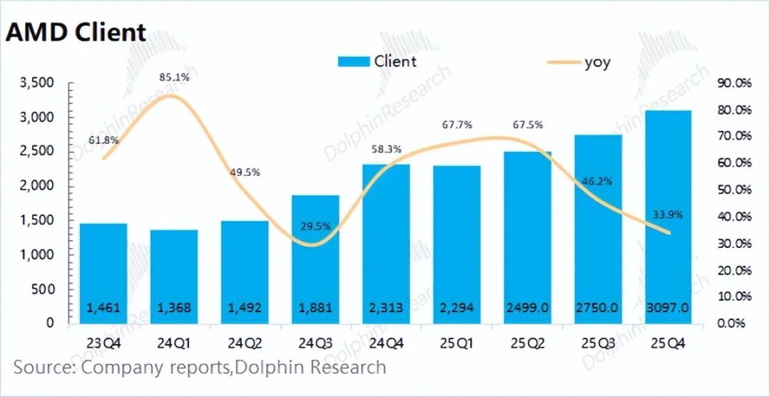 AMD的客户端业务在2025年第四季度实现收入31亿美元,同比增长34%,好于市场预期(29亿美元)。客户端业务的增长,主要得益于PC市场回暖以及对英特尔份额的侵蚀。