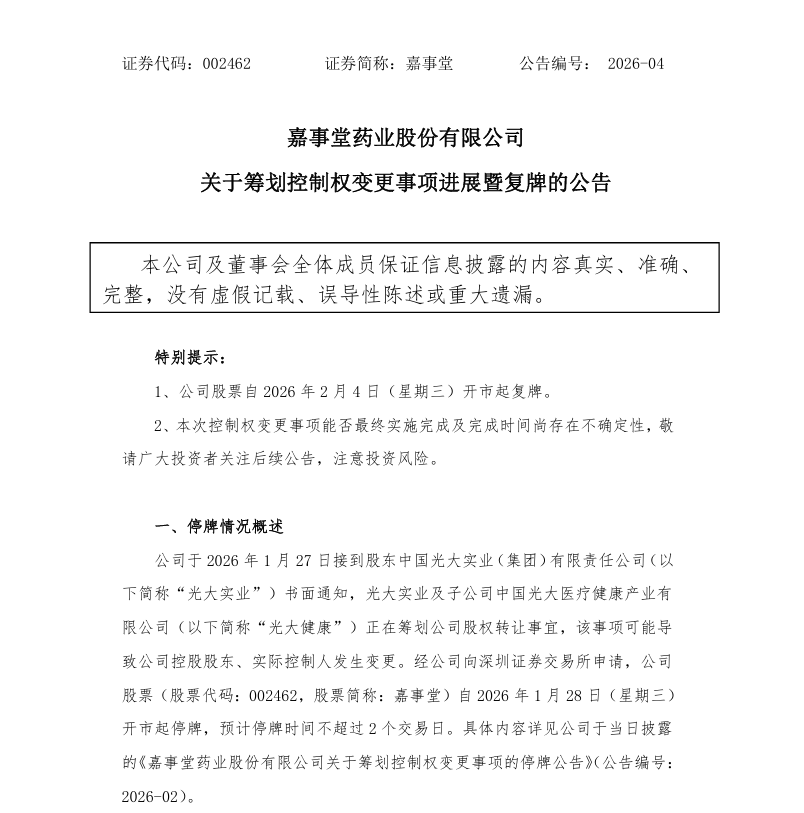 数日前,1月27日,嘉事堂接到股东光大实业书面通知,光大实业及子公司光大健康正在筹划公司股权转让事宜,该事项可能导致公司控股股东、实际控制人发生变更。公司股票申请自1月28日开市起停牌。