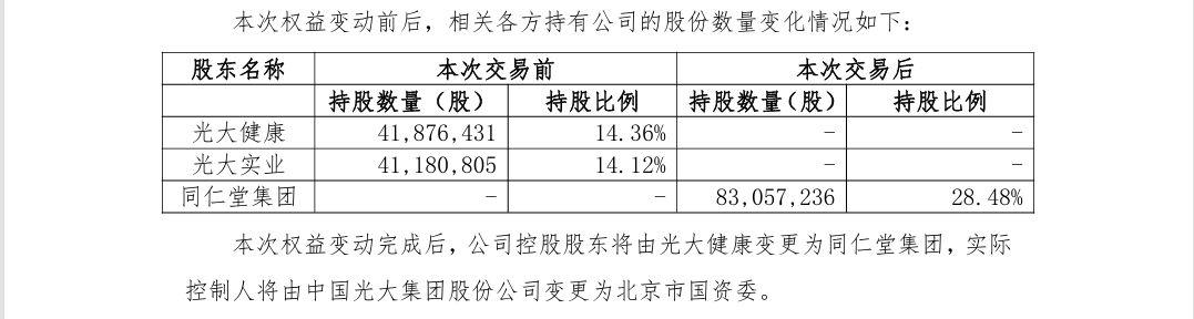 公告显示,此次股份转让价格为17.59元/股,转让价款总计为14.6亿元。其中,光大健康将其持有的公司41876431股股份(占公司总股本的14.36%)转让给同仁堂集团,转让价款为736606421.29元;光大实业将其持有的公司41180805股股份(占公司总股本的14.12%)转让给同仁堂集团,转让价款为724370359.95元。