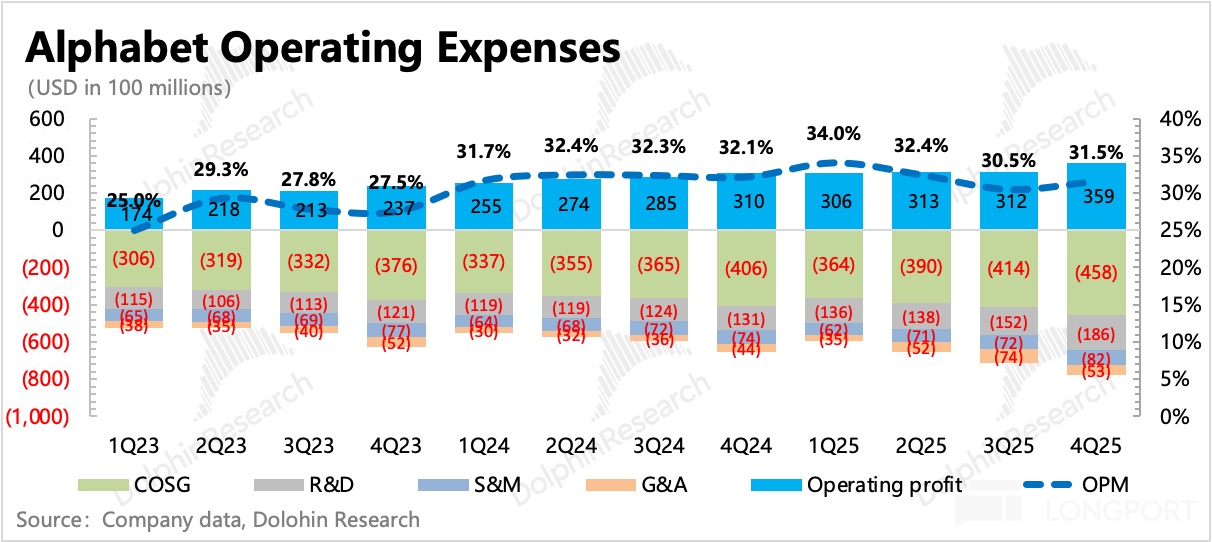 持续的 AI 投入下,盈利优化主要靠收入端的扩张。实际支出的绝对值上,Q4 增长了 19%,成本增长 13%,费用增长 29%。虽然最终 Q4 经营利润率还有接近 32%,环比、同比下滑还不是很明显。