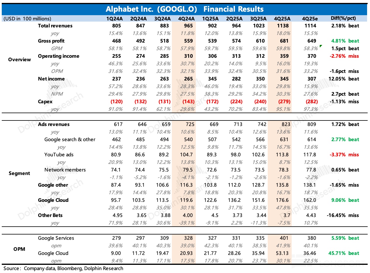 四季度谷歌整体营收 1138 亿,同比增长 18%(汇率顺风 1pct),高于一致预期。其中核心支柱,占比 70% 的广告业务,同比增长 13.6%,环比加速,云业务表现则更是 “一骑绝尘”。