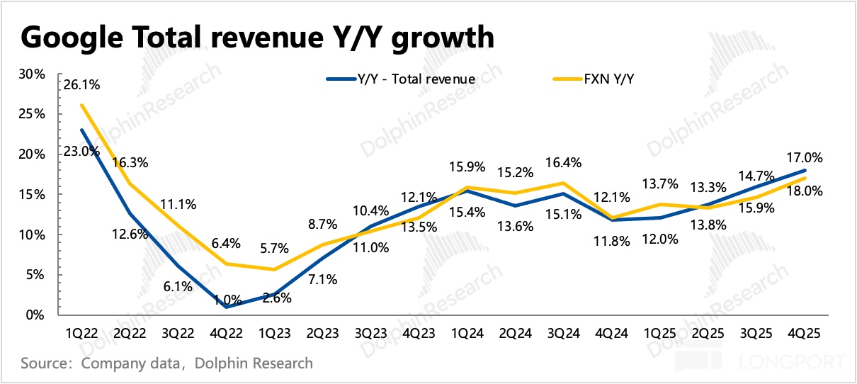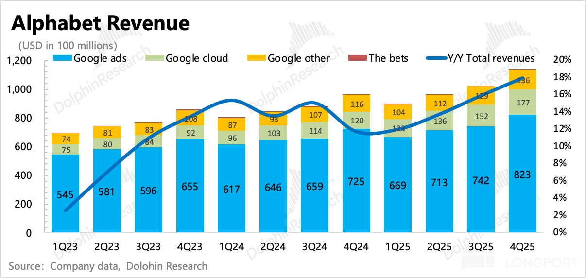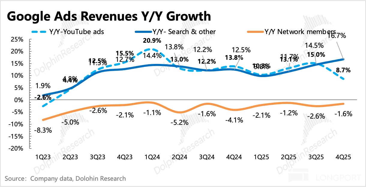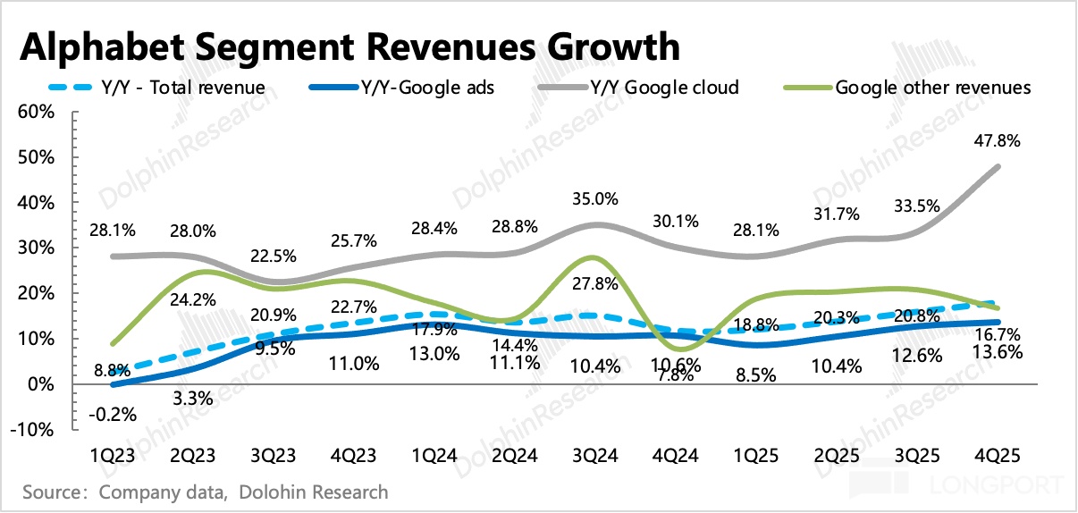 四季度广告收入 823 亿美元,整体增长 13.6%。核心搜索继续加速增长至 16.7%,强势的 Gemini 3 加持下,带动整体搜索继续回击 AI 颠覆论。但 YouTube 广告本季度却意外放缓,海豚君认为,可能与 Shorts 还没猛拉变现、YouTube TV 的品牌广告在四季度承压带来。