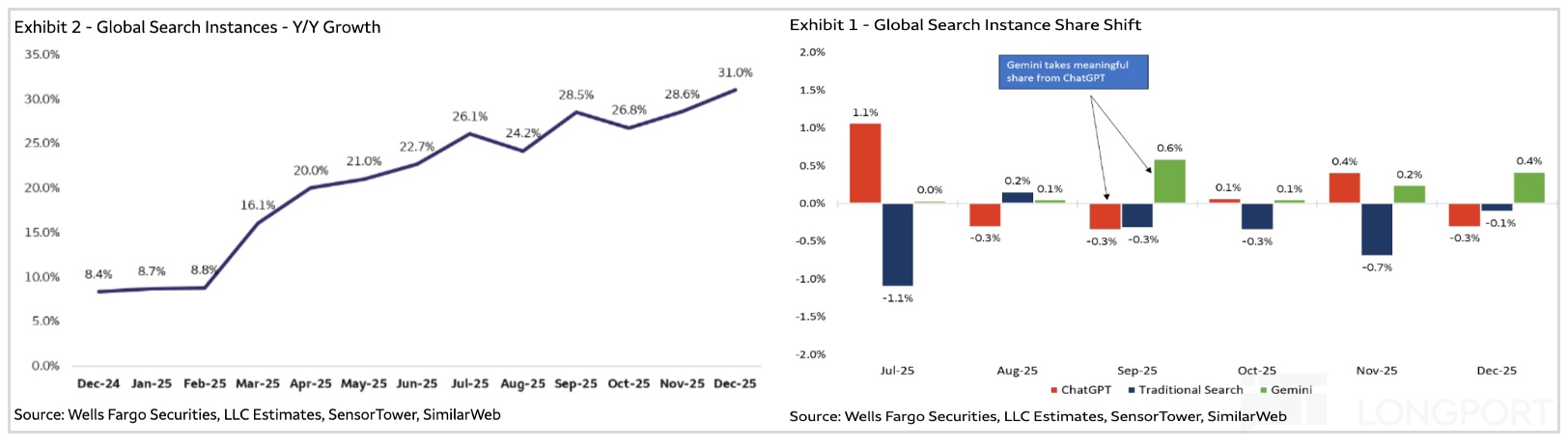 而 AI 对传统搜索的替代性影响,Google 靠着强大的 Gemini 3 守了下来(大大延缓了 ChatGPT 抢份额的节奏),当下正在享受用户迁移过程、还未完全崩塌的红利期——带动整体搜索的用户体验提升,用户搜索次数在过去一年加速增长。