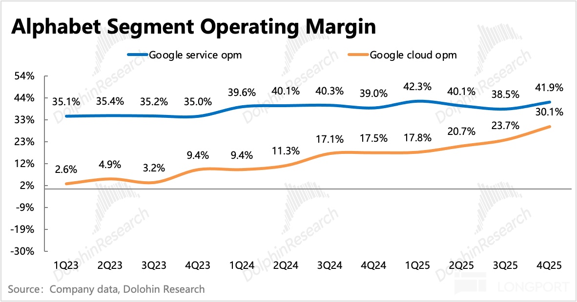 分业务来看,不仅谷歌服务业务环比走高,云业务利润率也进一步提高至 30%,而市场原本预期在投入压力下利润率走平就不错了。